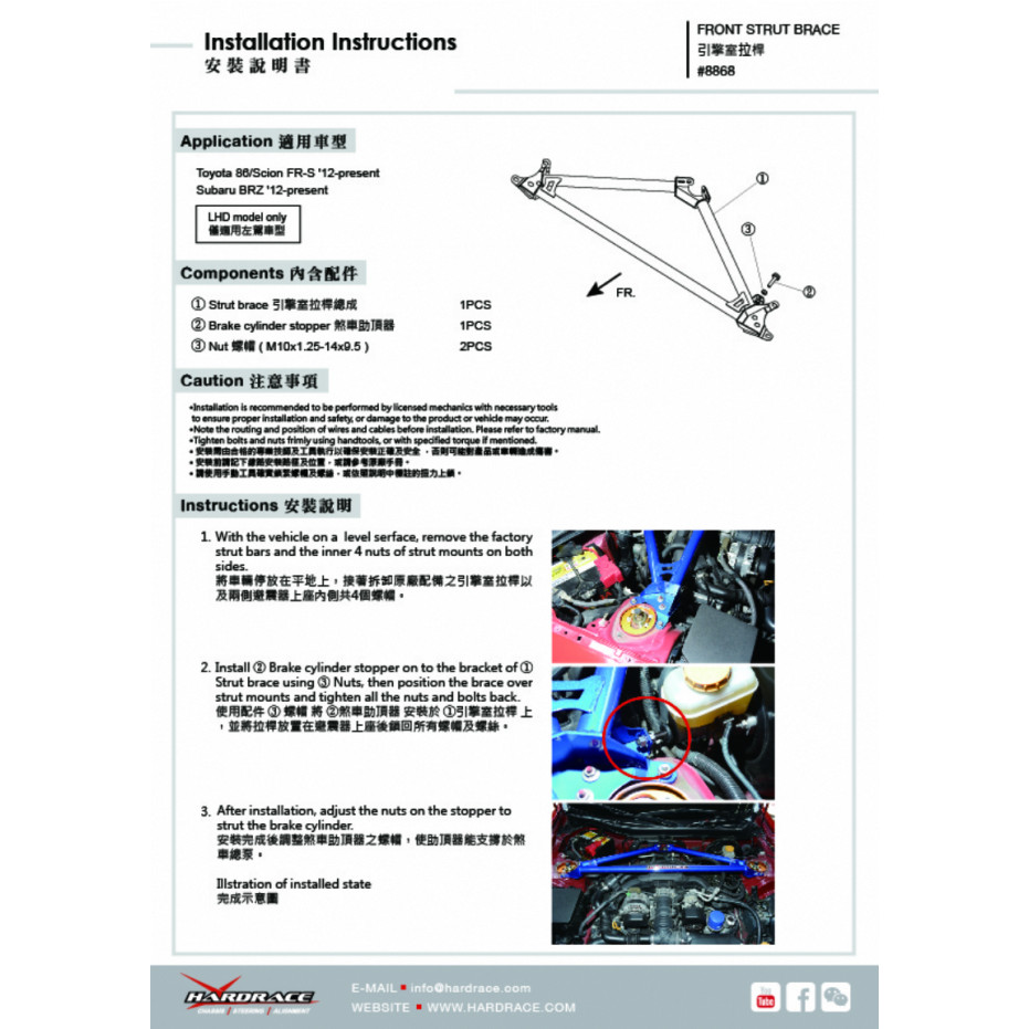 Barre anti rapprochement avant Hardrace Subaru BRZ Toyota GT86