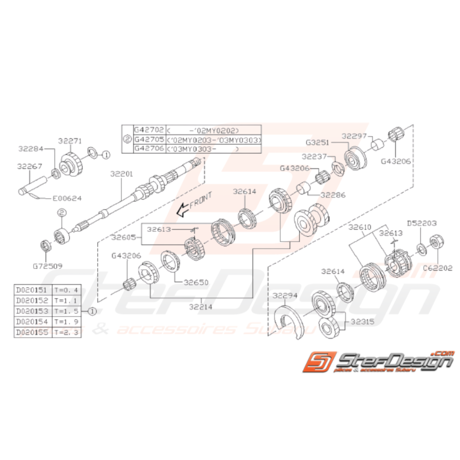 Schéma de l'ensemble des pièces composant l'ensemble d'arbre primaire pour Subaru WRX de 2001 à 2006