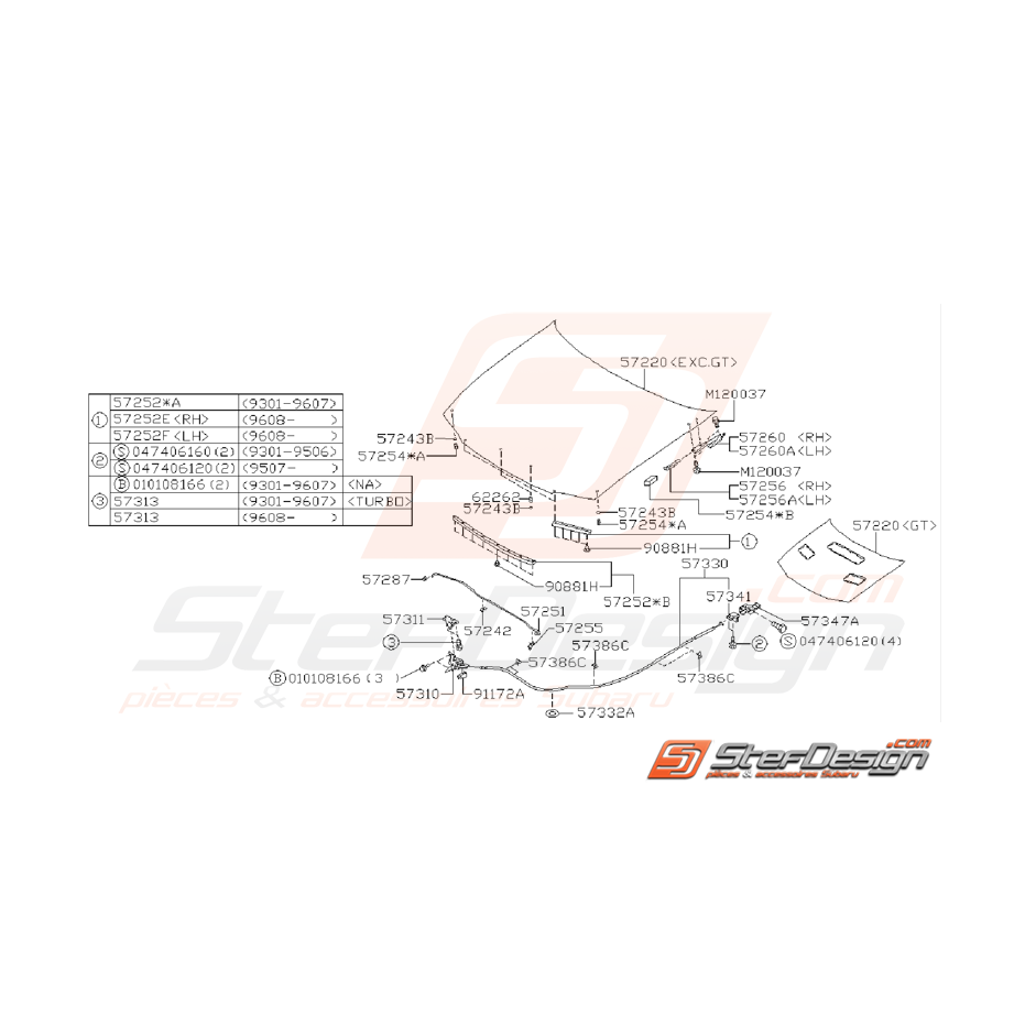 Schéma de l'ensemble des pièces de capot pour SUBARU IMPREZA GT de 1993 à 1996.