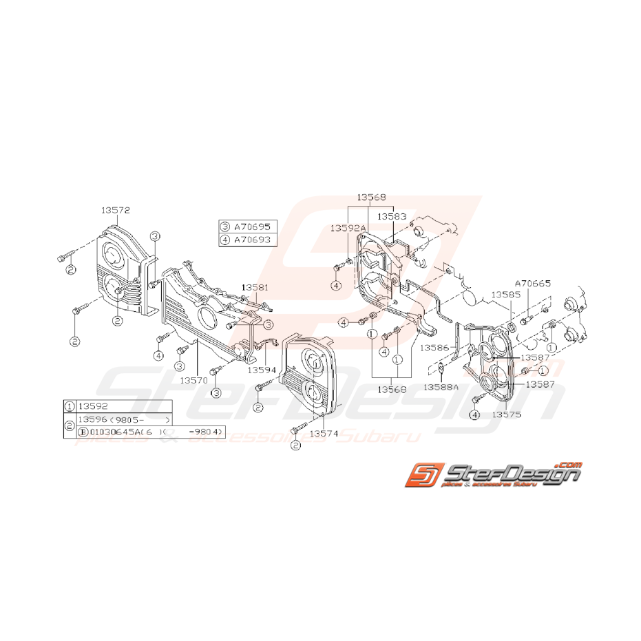 Schéma de l'ensemble des pièces de carter de distribution pur SUBARU GT de 1993 à 1998.