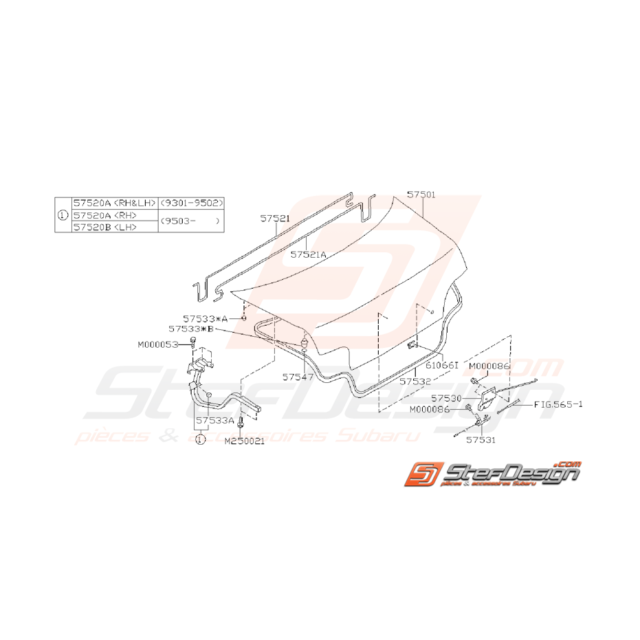 Schéma de l'ensemble des pièces de coffre pour SUBARU IMPREZA GT de 1993 à 2000.