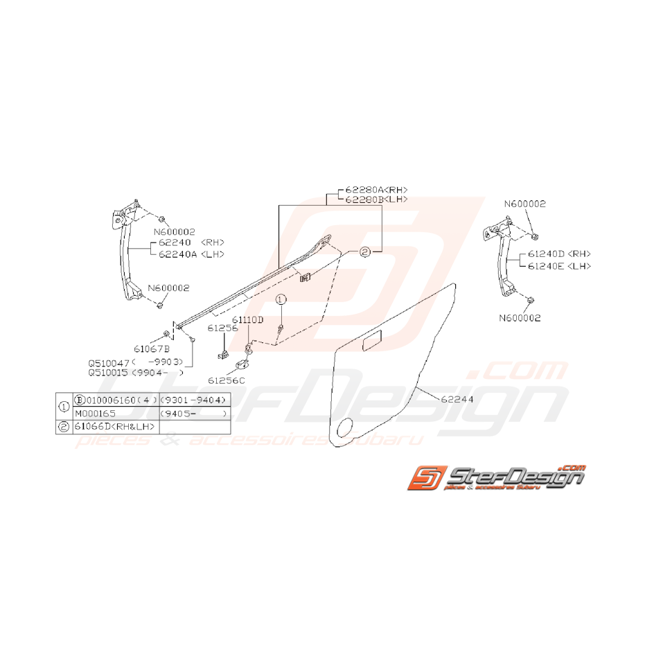 Schéma de l'ensemble des pièces d'intérieur de porte arrière pour SUBARU GT de 1993 à 2000.