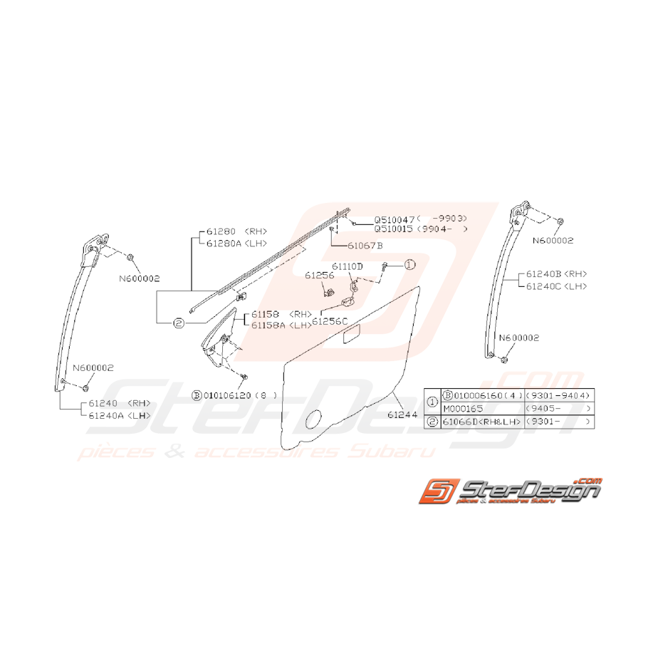 Schéma de l'ensemble des pièces d'intérieur de porte avant pour SUBARU GT de 1993 à 2000.