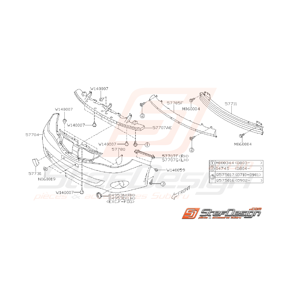 Schéma de l'ensemble des pièces de pare choc avant pour SUBARU WRX de 2008 à 2010.