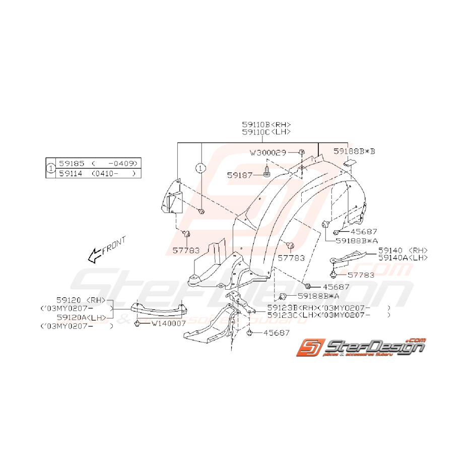 Schéma de l'ensemble des pièces de passage de roue pour Subaru WRX de 2003 à 2005 version break