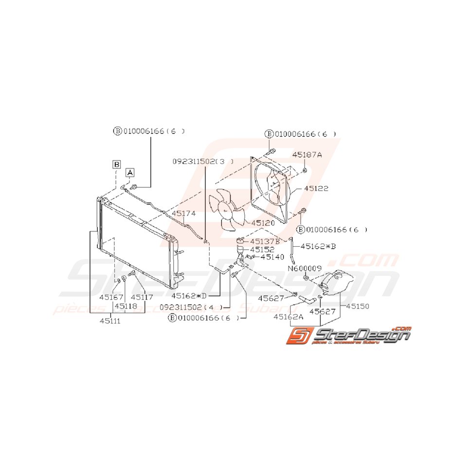 Schéma de l'ensemble des pièces de radiateur moteur pour SUBARU Impreza GT de 1993 à 2000.