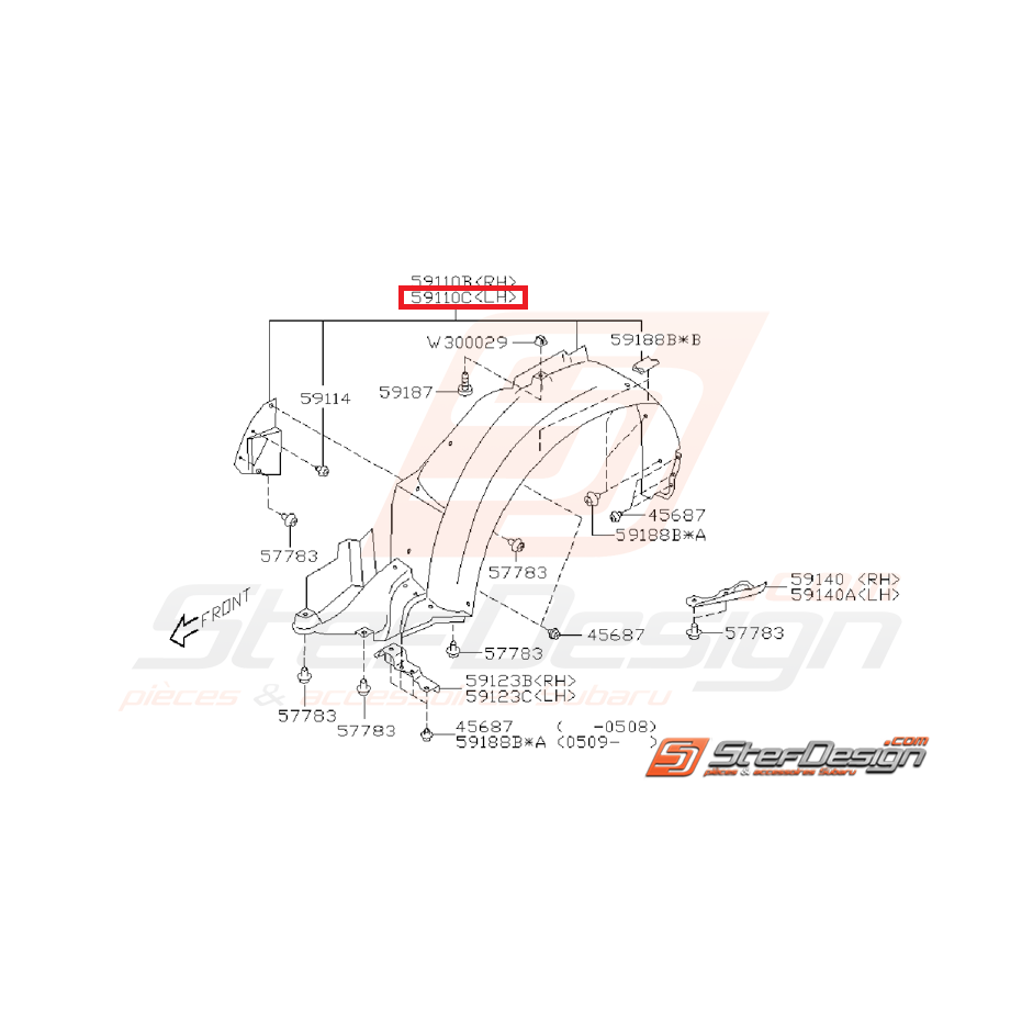 Pare boue avant coté conducteur origine SUBARU pour WRX et STI 2006 à 2007