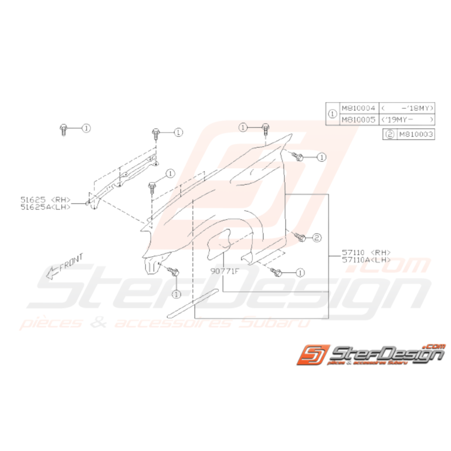 Schéma de l'ensemble des pièces de l'aile avant pour Subaru BRZ et GT86 de 2013 à 2019.