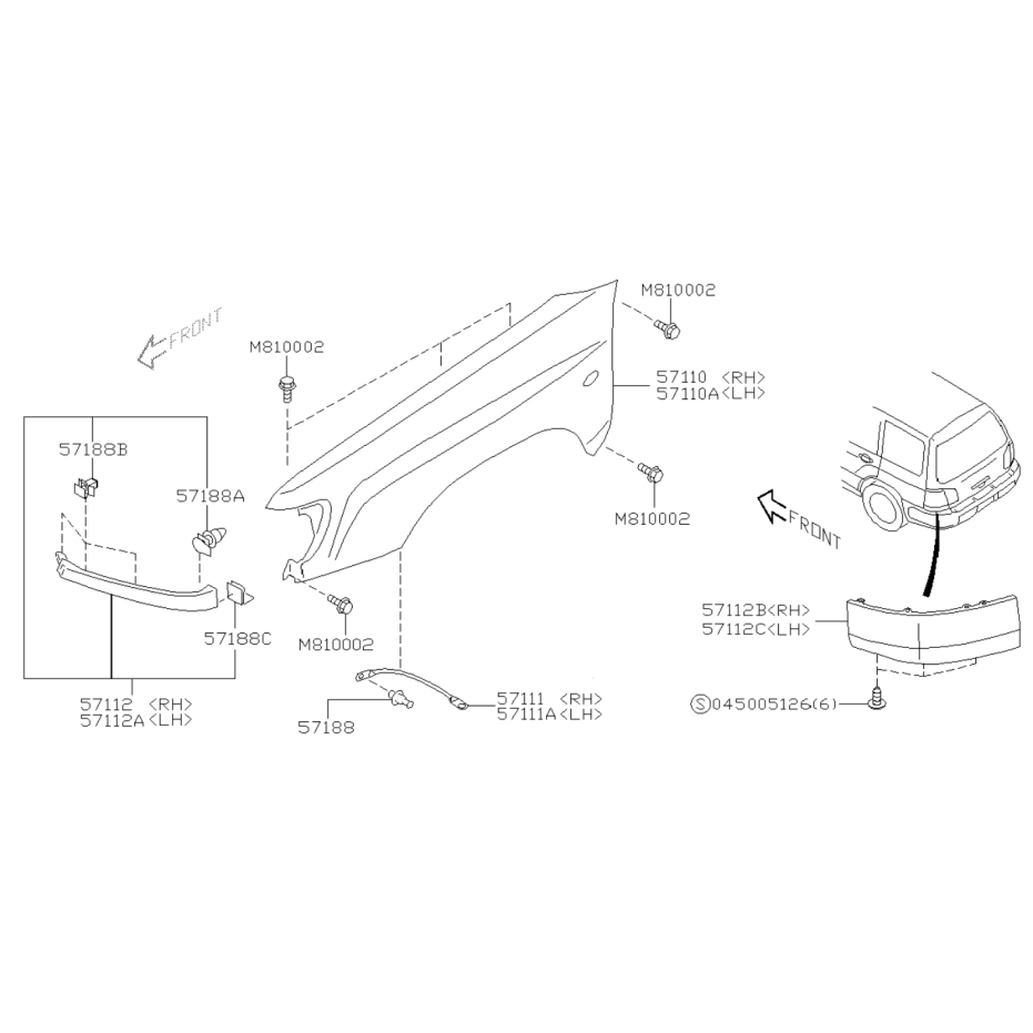 Schéma de l'ensemble des pièces d'aile avant pour Subaru Forester Turbo de 1997 à 2002
