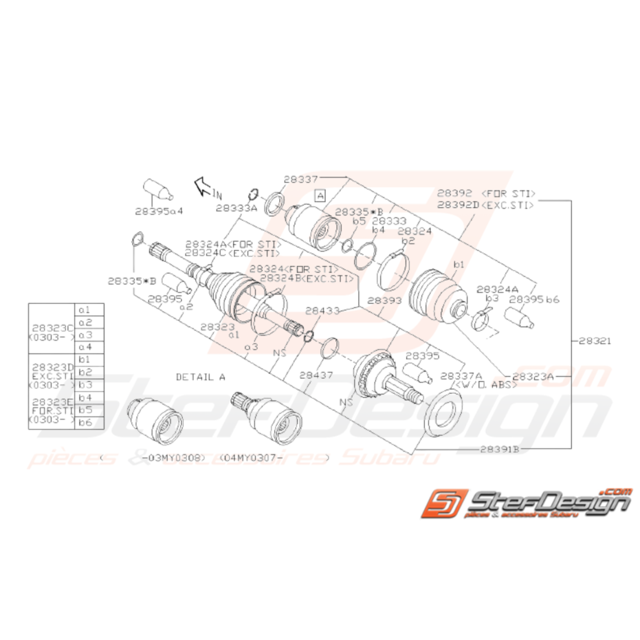 Schéma de l'ensemble des pièces de Cardan Avant pour Subaru WRX de 2001 à 2003.