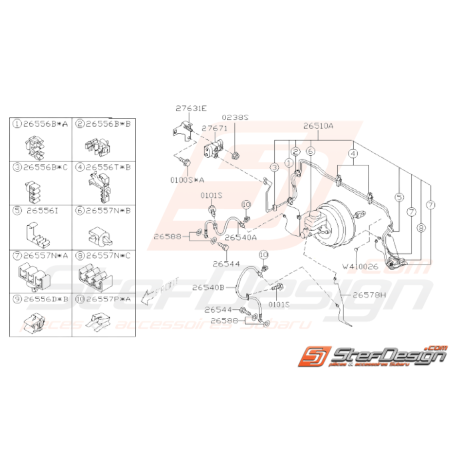 Schéma de l'ensemble des pièces de Conduites de frein pour Subaru WRX et STI de 2005 à 2007 sans ABS.