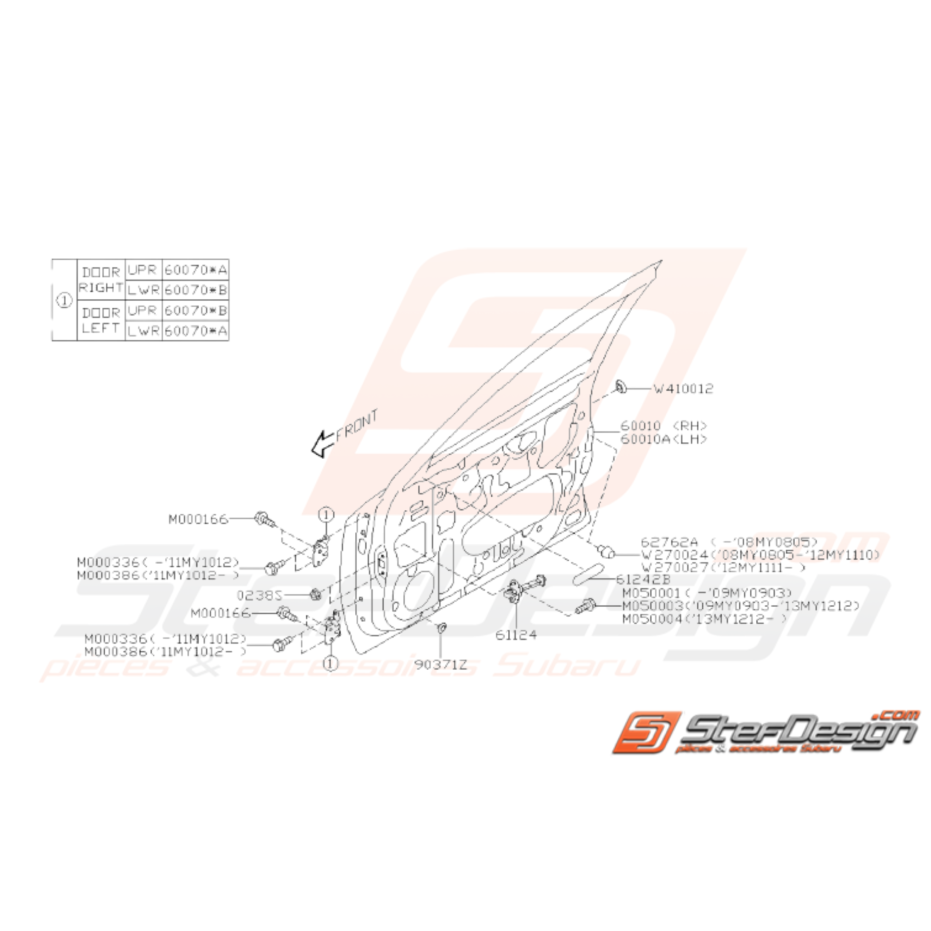 Schéma de l'ensemble des pièces de Porte Avant pour Subaru WRX STI de 2008 à 2014.