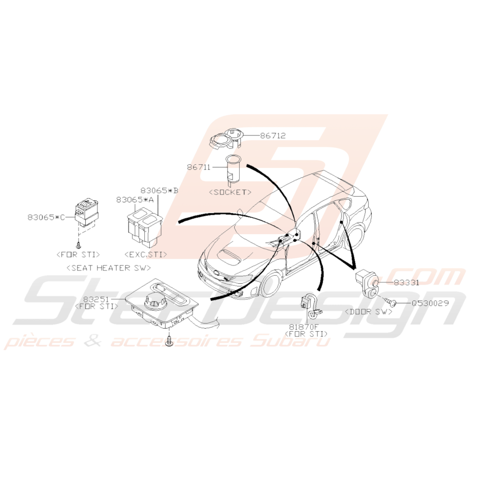 Schéma de l'ensemble des pièces d'Interrupteurs Console et Porte pour Subaru STI de 2008 à 2014.