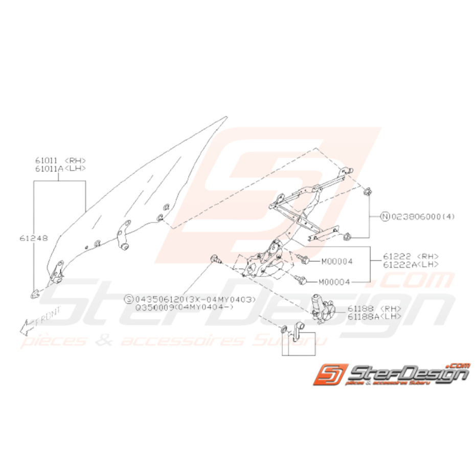 Schéma de l'ensemble des pièces de Mécanisme de Vitre Avant pour Subaru WRX STI de 2001 à 2007.