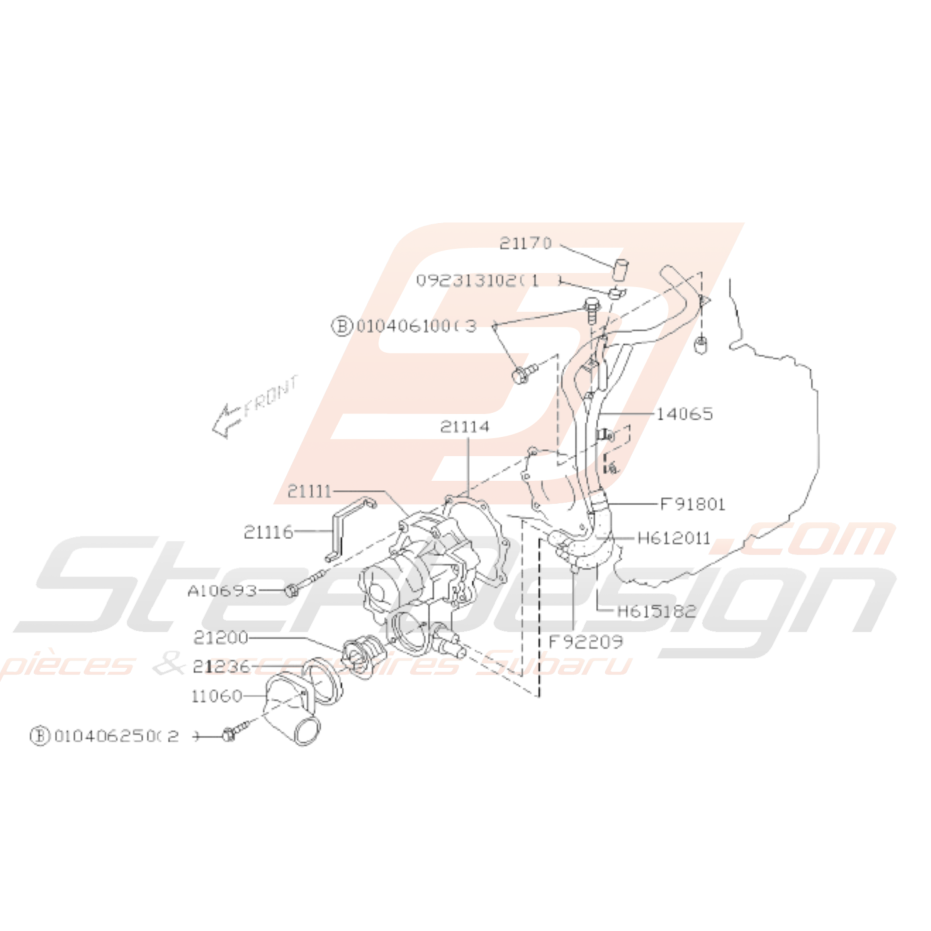 Schéma de l'ensemble des pièces de Pompe à Eau pour Subaru Forester Turbo de 1997 à 2002.