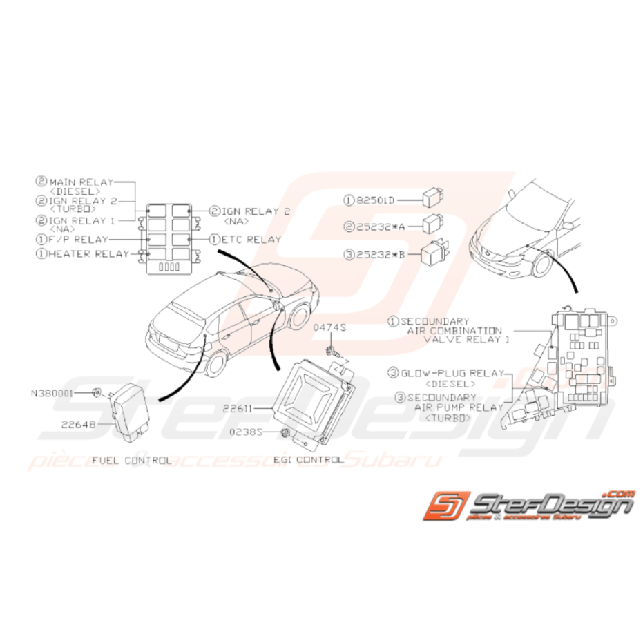 Schéma de l'ensemble des pièces de Relais et Sonde Moteur pour Subaru WRX de 2008 à 2009.