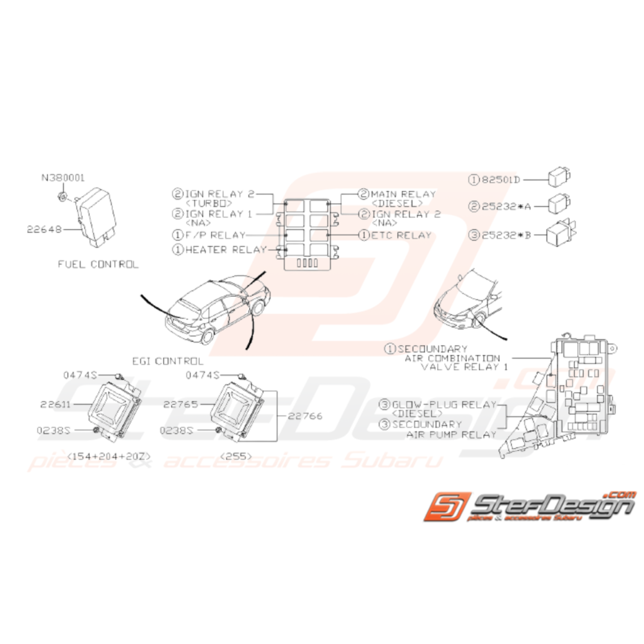 Schéma de l'ensemble des pièces de Relais et Sonde Moteur pour Subaru WRX de 2010.