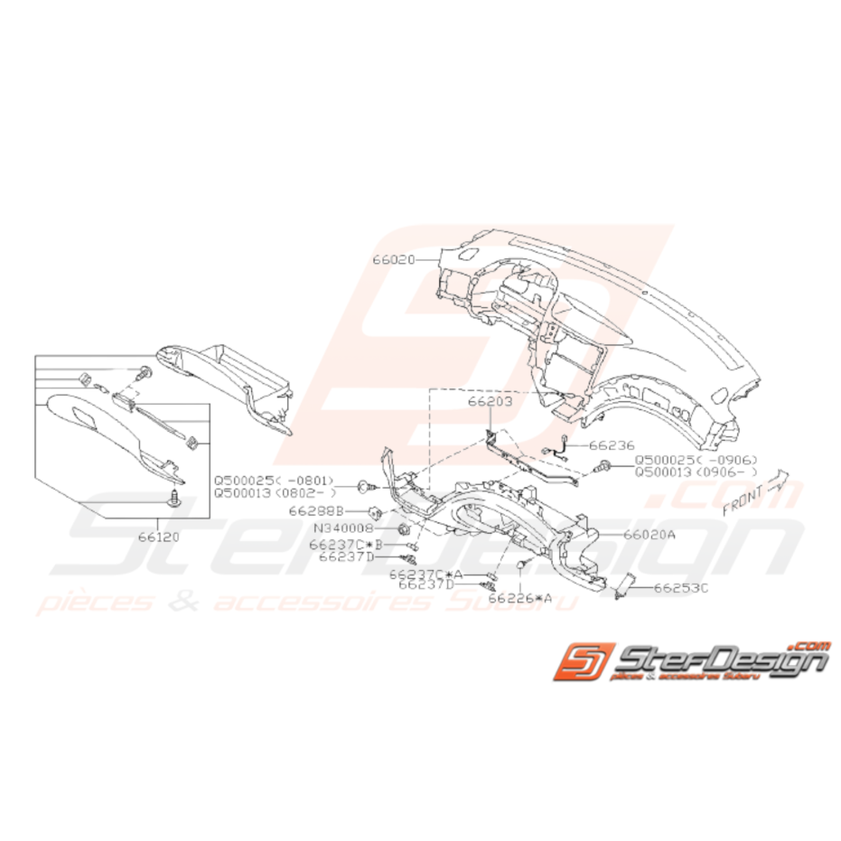 Schéma de l'ensemble des pièces de Tableau de bord Partie Basse pour Subaru WRX STI de 2008 à 2014.
