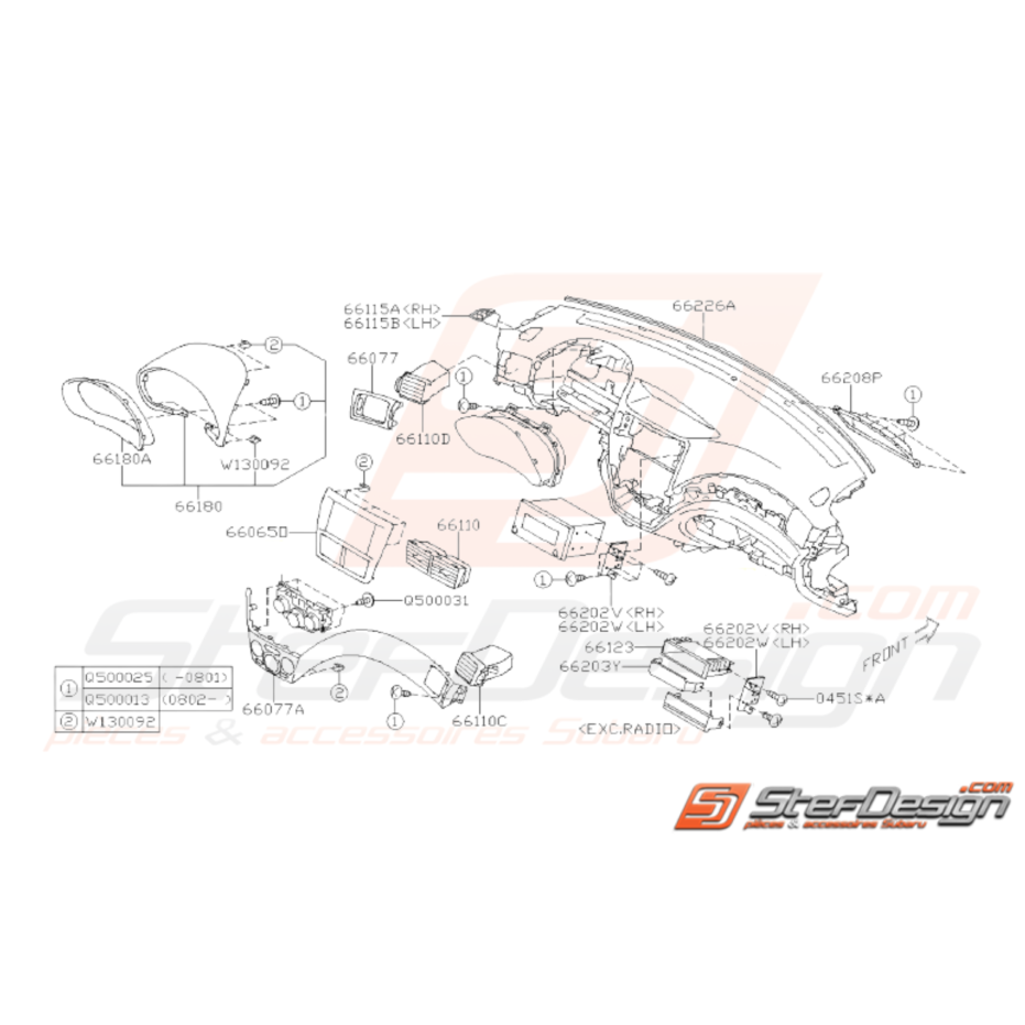 Schéma de l'ensemble des pièces de Tableau de bord Partie Haute pour Subaru WRX STI de 2008 à 2014.