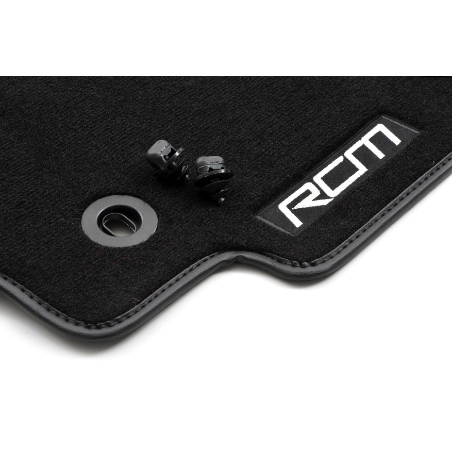 L'ensemble se compose de tapis avant et arrière, avec un talon supplémentaire du côté conducteur pour offrir une protection supplémentaire contre le talon de votre chaussure. Ils sont finis avec une reliure en cuir cousue au bord du tapis, puis finis avec le logo RCM brodé. Le tapis conducteur dispose également d'un point d'ancrage supplémentaire.