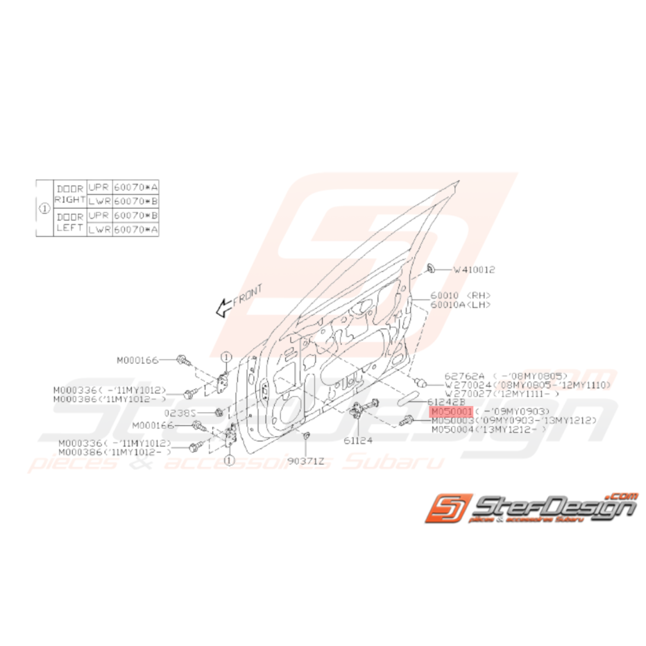 Vis à collerette porte avant SUBARU WRX et STI de 2001 au 03 Septembre 2009.